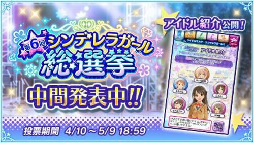 先程デレラジ☆で中間の順位が公開されたのに続き、ゲーム内でも中間発表が公開されました。 まず、全体の上位は以下の通り。 開始前から本命予想されている楓さんが現時点で1位。続いて昨年惜しくもボイス圏内に入らなかった肇ちゃん、NG全員シンデレラガー…
